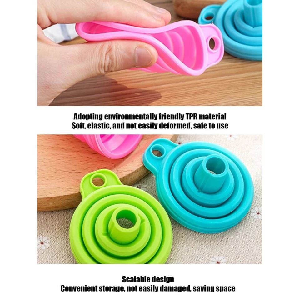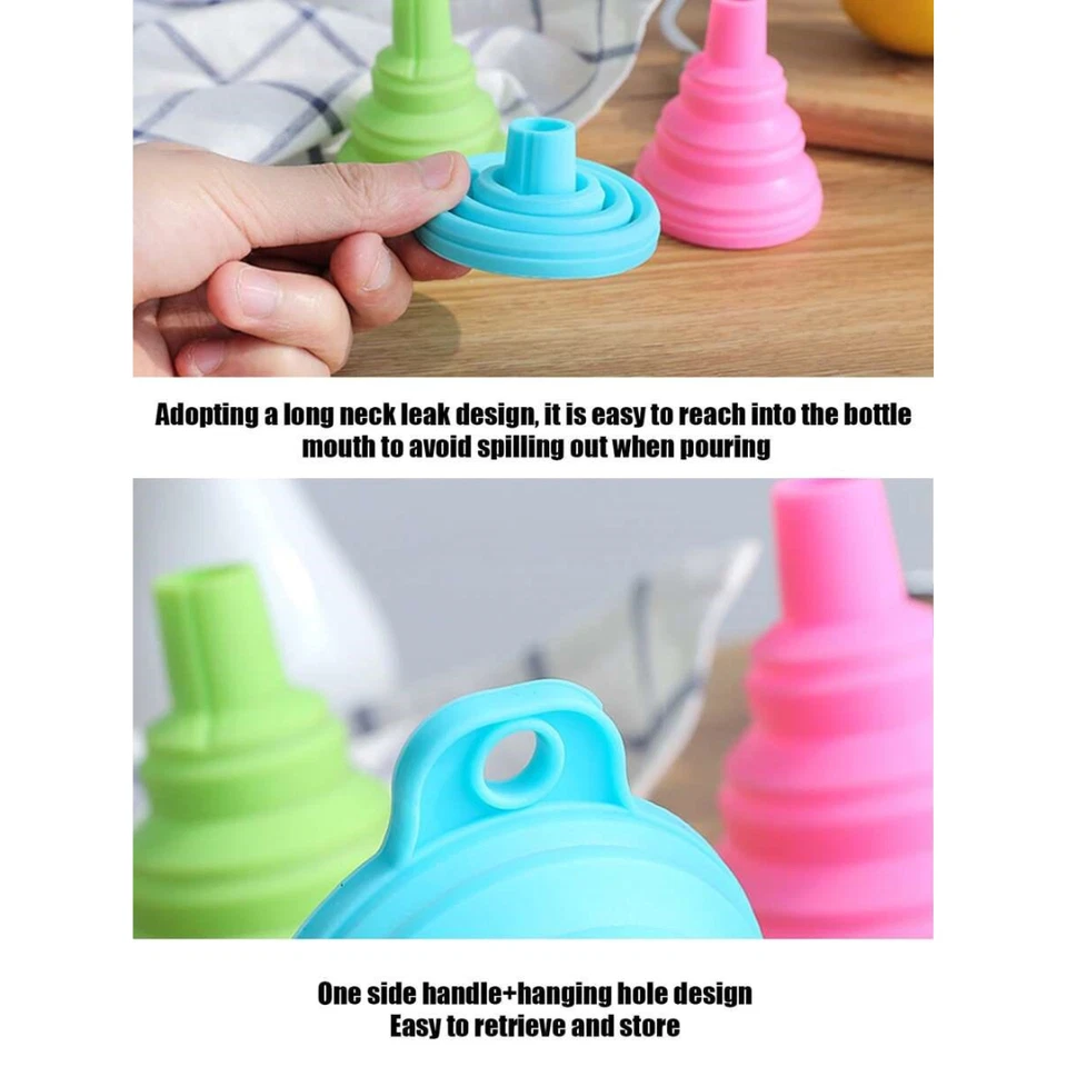 🌀 Collapsible & Space-Saving Design: Thanks to the telescopic folding feature, these funnels easily collapse to only 2 cm in height! Store them anywhere without taking up much space in your kitchen drawer or bag.