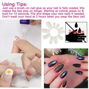 Using Tips: Just use a brush-on nail glue so your nail is fully coated, this makes the tips stay on longer. Starting at cuticle, press on & hold for 10 seconds. File and shape your new nails if needed. Don’t wash your hand at 2 hours when you wear the new nail.