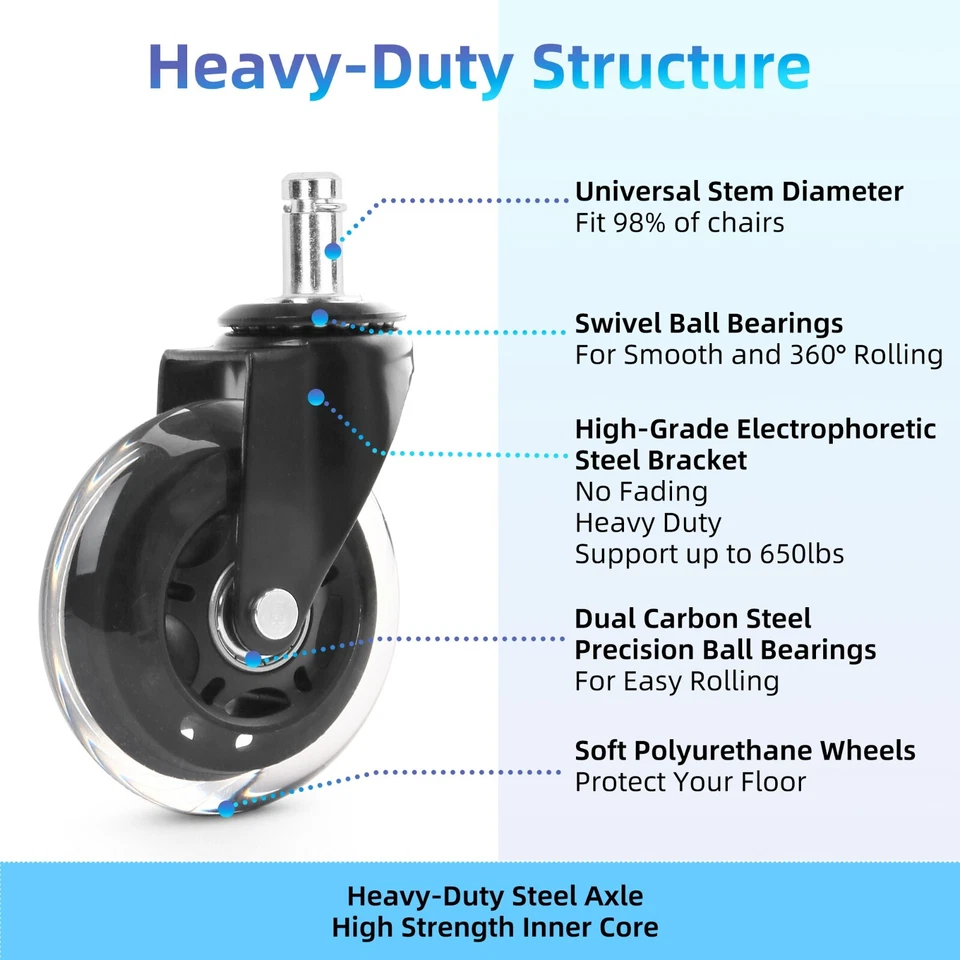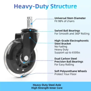 Our stem caster wheels are made from top-grade steel, precision ball bearings, and durable PU; Safely support up to 650 lbs by a set of 5.