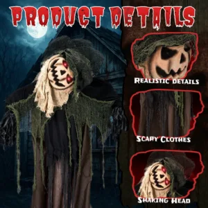 Bring your Halloween scene to life with this terrifying animatronic wizard with pumpkin face. Standing at life size, this sound-activated Halloween decoration is designed to shock and thrill. Once triggered, the wizard’s head will move to one side and glowing red eyes light up, and eerie male voice phrases play, creating an unforgettable spooky experience. Ideal for haunted houses, yard displays, or indoor Halloween parties, it sets up in just minutes and runs on batteries, giving you complete freedom to place it wherever the scares are needed most.