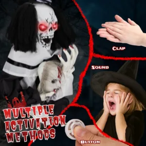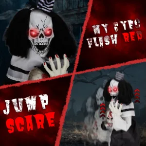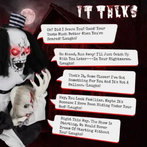 1. Creepy Sound-Activated Performance: Triggered by sound, the clown’s red eyes glow, it lets out scary phrases, and starts bouncing to create an eerie and surprising Halloween experience.