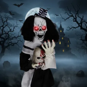 2. Compact and Spooky Tabletop Size: Standing at 1.8 feet tall, it’s the perfect size for tabletops, steps, or smaller haunted spaces while still delivering a big scare.