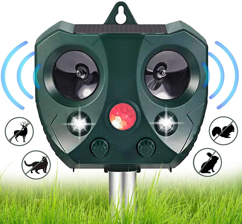 - Humanistic & Versatile: No traps, no harm to human or animals and chemical free. Adjustable frequency and sensitivity dials allow you to get rid of cats, dogs, birds, mice, squirrels, rats, skunks, raccoons, birds, deer, mosquitoes and more. Or set it to repel all of them at the same time.
