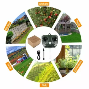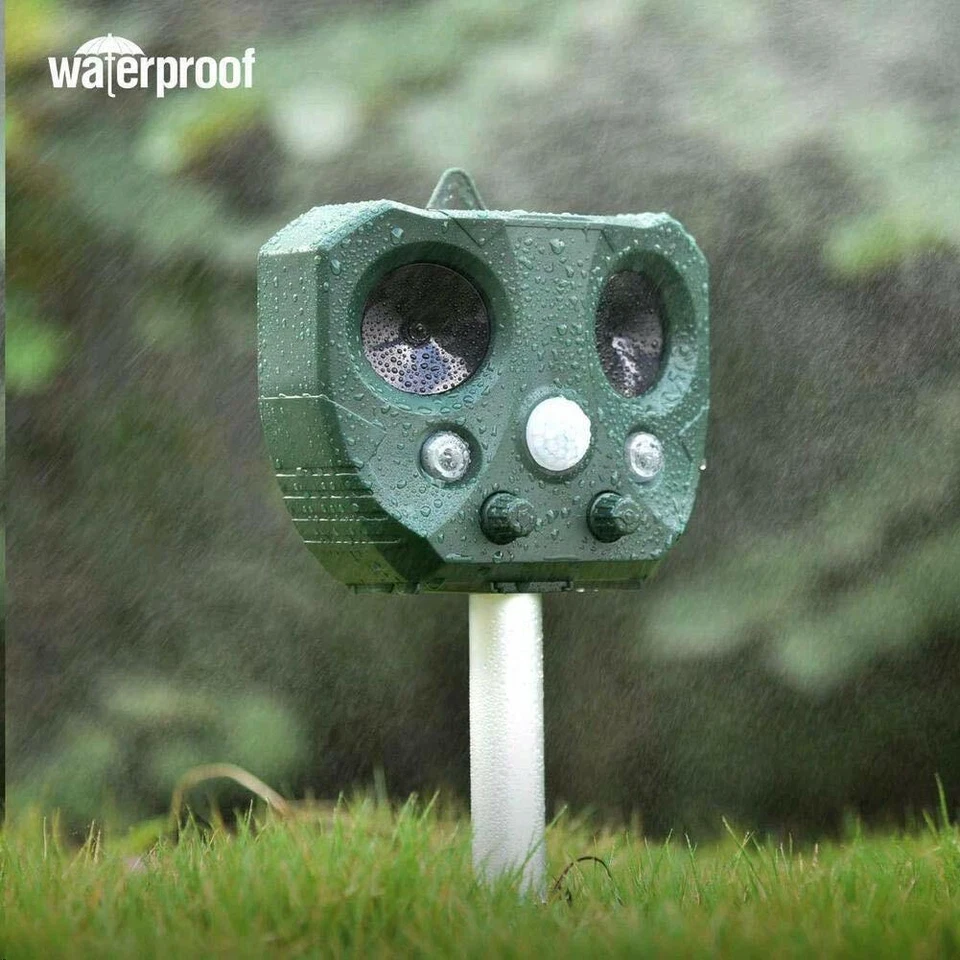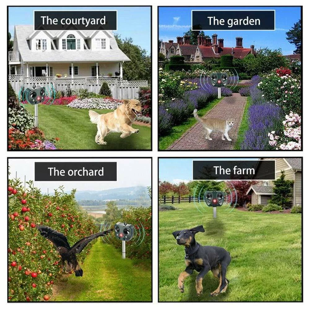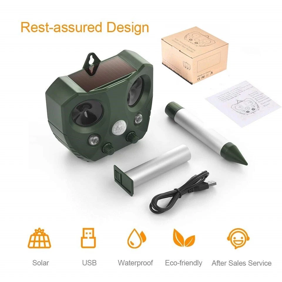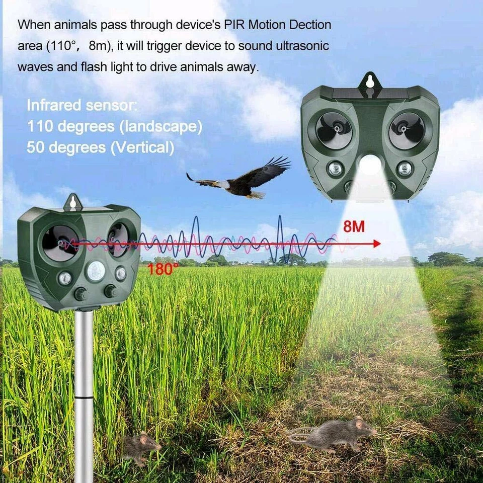 - Easy To Install: You can simply insert the animal repeller into the ground with a removable pole (included) or hang up where there is plenty of sun light and switch it on, which is perfect for yards, patios, garages, attics, porches, boats, gardens, farms, ponds, etc.. Note: Please leave the pole 12 cm or more above the ground. Don’t hammer directly on the device but dig a hole to mount it.